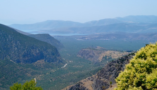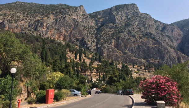 Per raggiungere il sito archeologico del Santuario di Delfi occorre uscire dal paese, tornando indietro per un breve tratto a piedi che costeggia la vallata che si affaccia sul Golfo di Corinto: