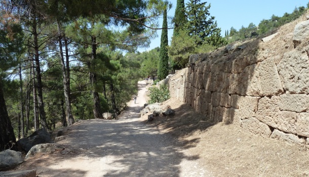 La Via Sacra conduce al Tempio di Apollo, dove risiedeva la Pizia: all’ingresso del tempio era scolpita anche la famosa frase “ΓΝΟΤΙ Σ’ΑΥΘΟΝ” (Conosci Te Stesso) resa famosa da Socrate.