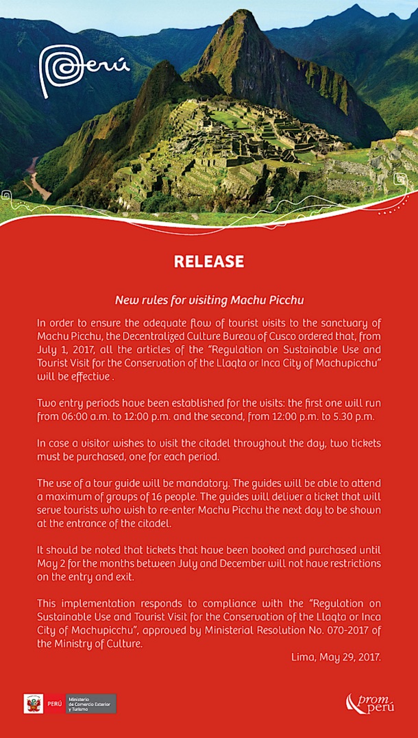 Secondo quanto riportato nel comunicato di PromPerù, ente ufficiale del turismo peruviano, il Ministero della Cultura del Peru e la Direzione culturale di Cusco hanno stabilito nuove modalità di accesso e visita a Machu Picchu per cercare di regolare il massiccio afflusso di turisti degli ultimi anni.
